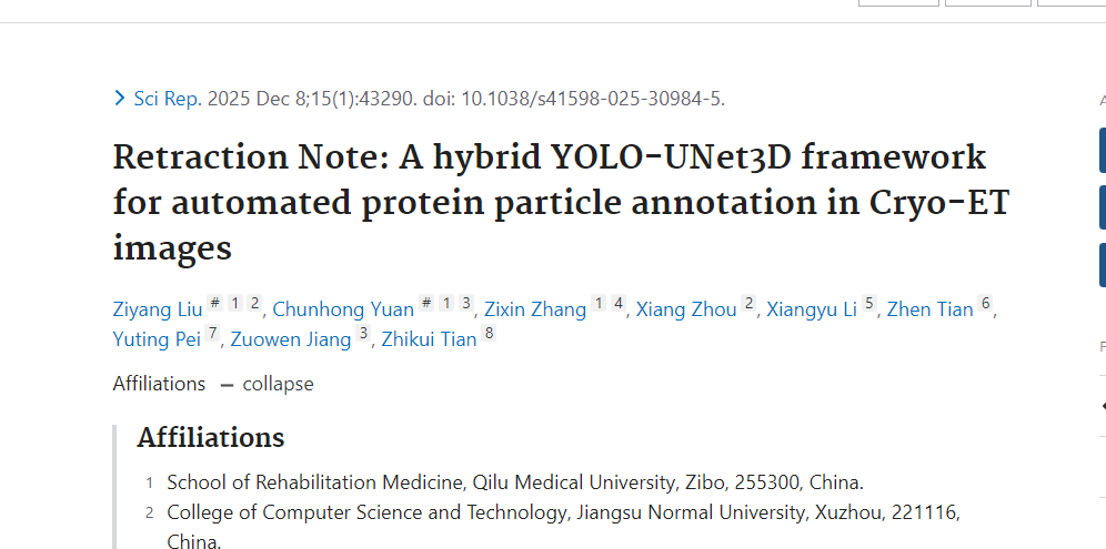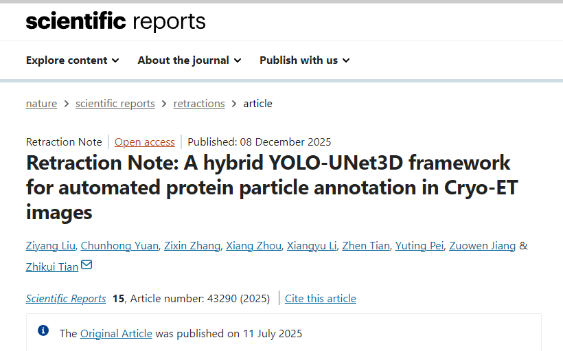 2025 年 12 月 8 日,国际期刊《Scientific Reports》(简称 Sci Rep)发布一则撤稿声明,宣布撤回一篇今年 7 月 11 日发表的关于冷冻电镜断层扫描(Cryo-ET)图像中蛋白质粒子自动标注的研究论文。该论文曾提出 “混合 YOLO-UNet3D 框架”,如今因存在内容抄袭问题,正式从期刊数据库中移除。