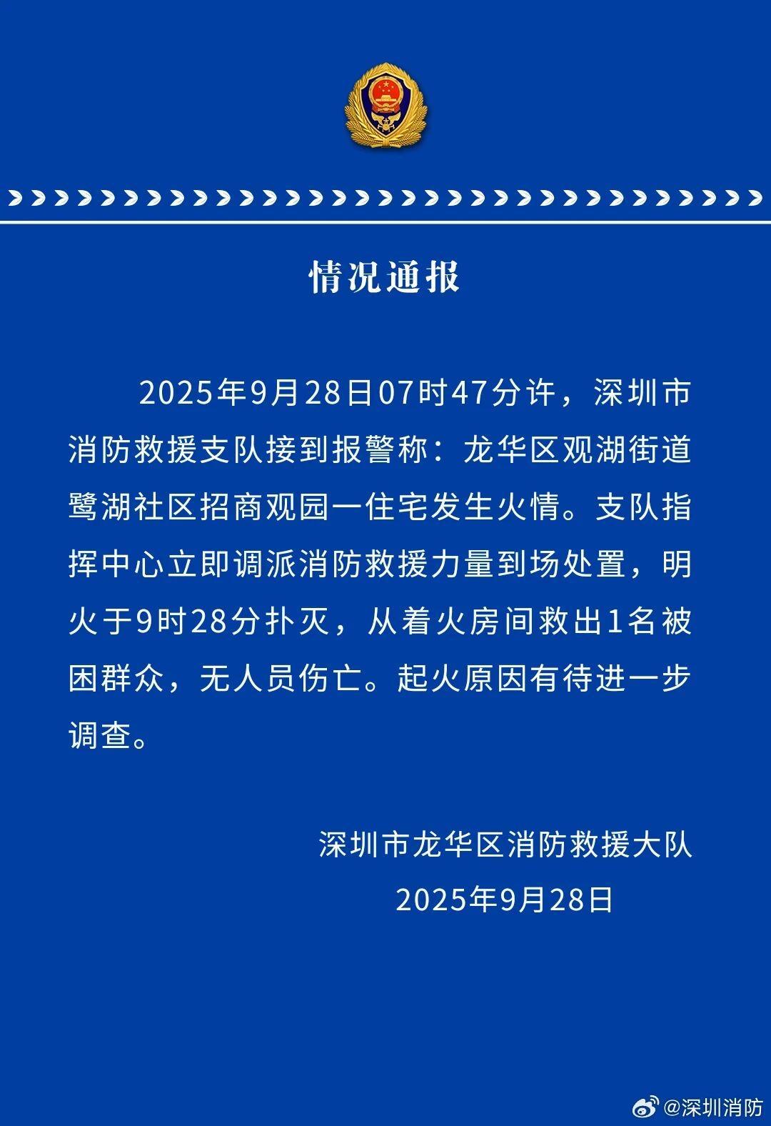 28日中午,深圳市龙华区消防救援大队发布情况通报:2025年9月28日07时47分许,深圳市消防救援支队接到报警称:龙华区观湖街道鹭湖社区招商观园一住宅发生火情。支队指挥中心立即调派消防救援力量到场处置,明火于9时28分扑灭,从着火房间救出1名被困群众,无人员伤亡。起火原因有待进一步调查。